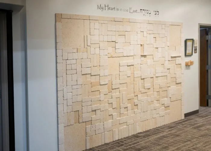There is a uniquely special, indescribable feeling one has when standing at the Kotel (The Western Wall) in Jerusalem. In honor of Israel’s 75th birthday, Temple Sinai built a Kotel replica in order to provide our students with a tangible way of emulating a visit to the actual Kotel and thereby strengthen their bonds with the Land of Israel. The quote “Libi b’mizrach – My heart is in the East” written above our Kotel attests to the importance of this enduring connection. Youth and adults alike are invited to write private notes of prayer and place them in the crevices on the wall. When our Sinai community travels to Israel, these notes are gathered and taken to the actual Western Wall, furthering the tie to our spiritual homeland.
